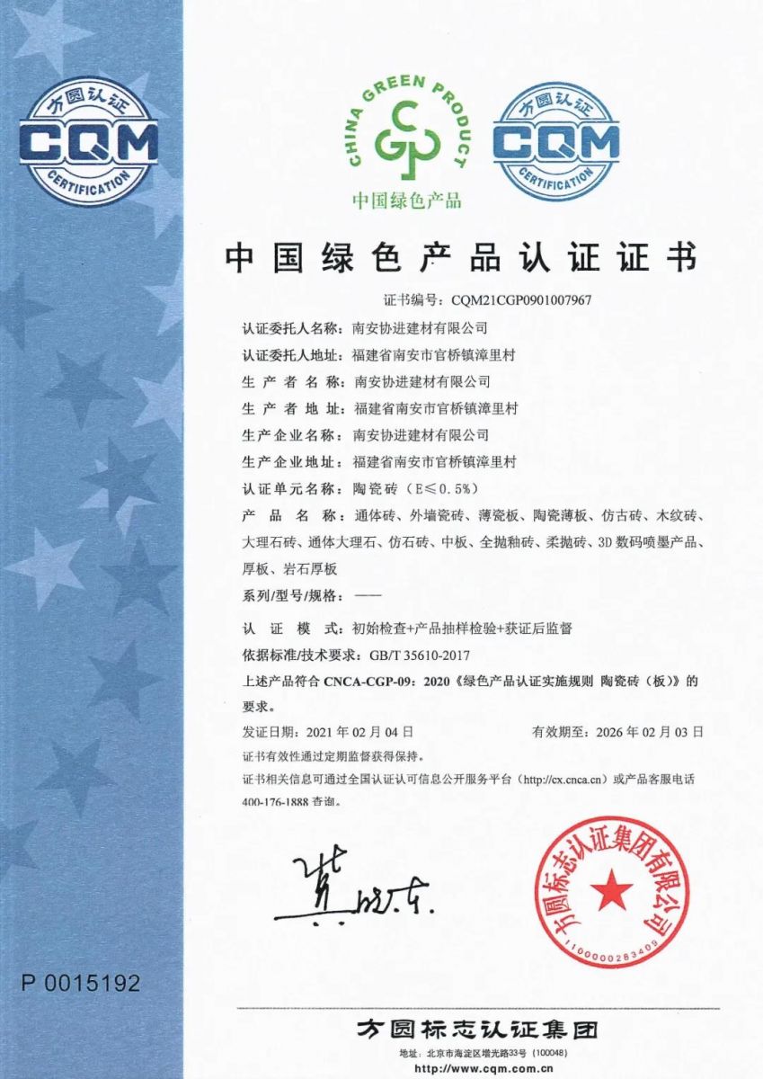 憑借持續(xù)踐行“綠色、節(jié)能、環(huán)保”的發(fā)展理念通過“中國綠色產(chǎn)品”認證。是對2012年獲評“全國節(jié)能先進集體”、2017年通過“三星級綠色建材評價標識”認證后的鼓勵和再次肯定。協(xié)進陶瓷將繼續(xù)與社會各界一同攜手構(gòu)建低碳環(huán)保建筑體系,為實現(xiàn)企業(yè)與社會的可持續(xù)發(fā)展繼續(xù)努力。