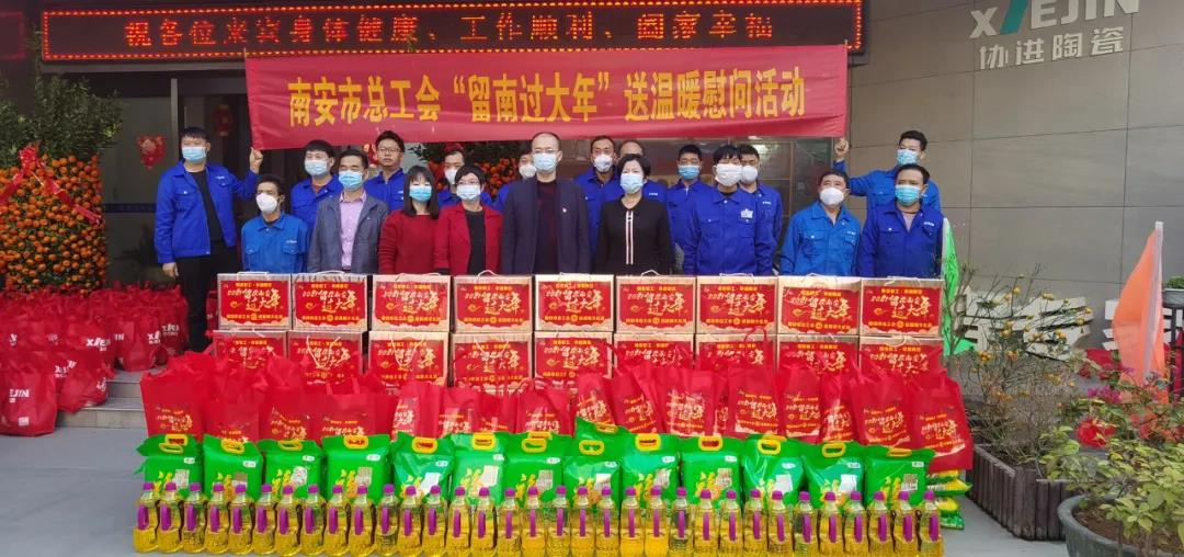 臘月時節(jié),暖風徐徐。南安市紀委監(jiān)委駐市總工會機關(guān)紀檢監(jiān)察組副組長姚添丁、南安市總工會組織部負責人陳雅婷帶隊,在官橋鎮(zhèn)黨委二級主任科員、鎮(zhèn)總工會主席李彩芳,官橋鎮(zhèn)人力資源和社會保障所所長、鎮(zhèn)總工會副主席蔡偉忠等人的陪同下,蒞臨協(xié)進公司走訪慰問留南過年的外來員工,為員工們送來了黨委、政府、工會娘家人的新春關(guān)懷和溫暖禮包。